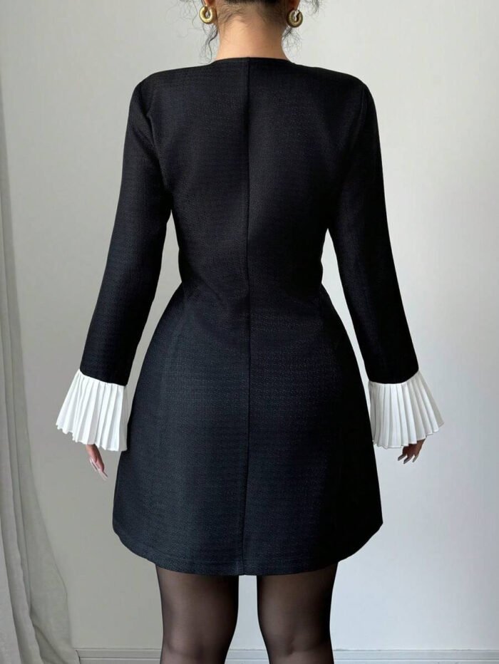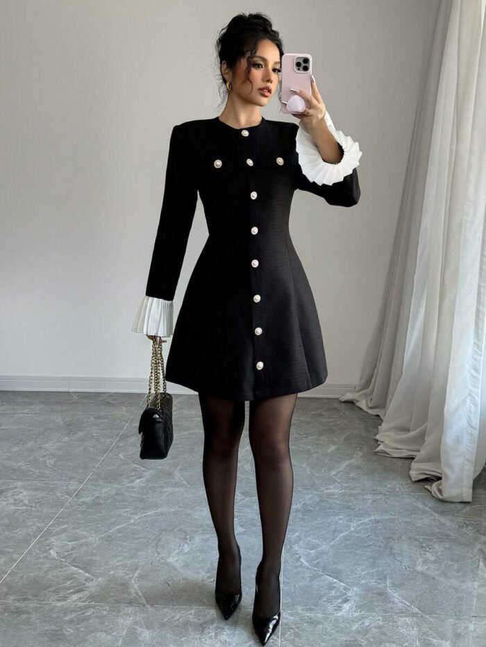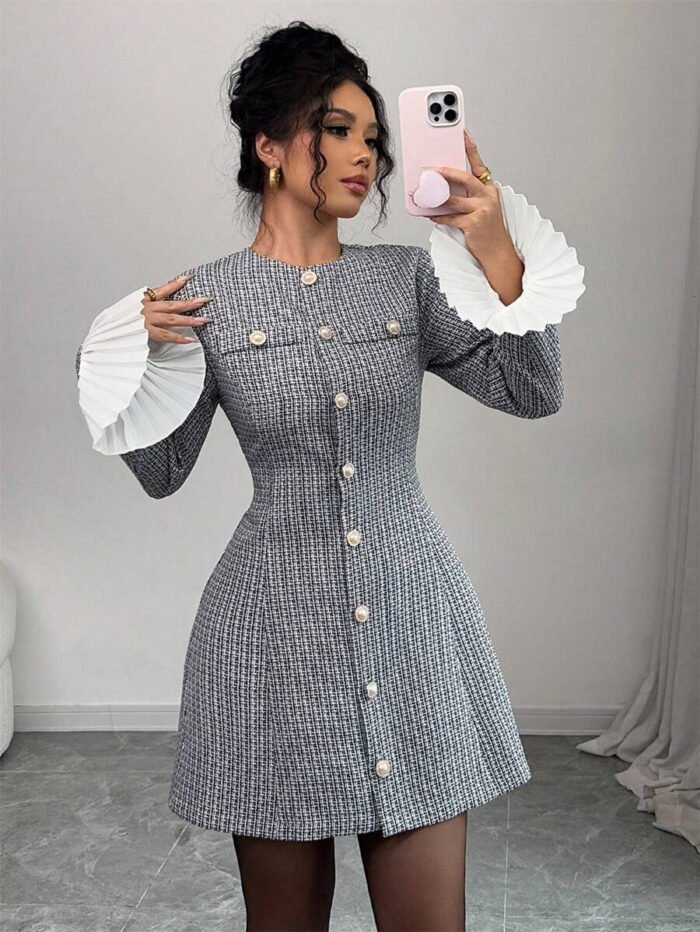 - تصميم عصري: فستان قصير بأكمام طويلة منفوشة مع أزرار معدنية تضفي لمسة جمالية.
